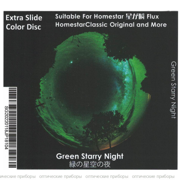 Дополнительный цветной диск для планетариев SegaToys Homestar Original, Classic, Pro, Pro 2, Pure Earth Theater, Flux, Matataki. Диаметр диска 60 мм.Проекционный диск Green Starry Night передает изображение зеленого ночного неба с яркими звездами и с Млечным путем. Он создан с использованием фишай объектива, который обеспечивает обзор всего неба и горизонта на 360 градусов.