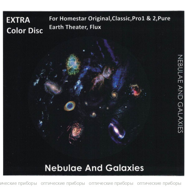 Дополнительный цветной диск для планетариев SegaToys Homestar Original, Classic, Pro, Pro 2, Pure Earth Theater, Flux, Matataki. Диаметр диска 60 мм.На диске изображены реальные фотографии высокого разрешения туманностей и галактик:галактика NGC 6217 в созвездии Малая Медведица,галактика NGC 1300 в созвездии Эридан,туманность Кольцо в созвездии Лиры,Крабовидная туманность в созвездии Тельца,туманность Бабочка,и некоторые другие.