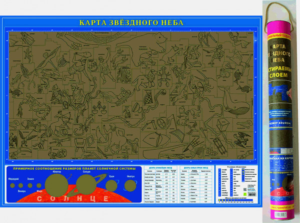 На карту нанесен специальный слой , который легко можно удалить монеткой. Под этим слоем находится более полная цветная картинка созвездия или планеты. Подарочный вариант в тубусе.Карта звездного неба со стираемым слоем будет прекрасным, познавательным, оригинальным подарком.