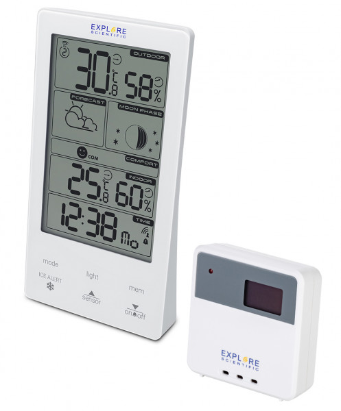 Метеостанция Explore Scientific Classic Vertical с внешним датчиком предназначена для измерения температуры и влажности воздуха. Также она умеет составлять прогноз погоды на 12 часов, показывает время и дату, фазу Луны, может предупредить о заморозках и разбудить на работу сигналом будильника. Это простой в настройке и управлении метеоприбор, который оптимально подходит для размещения в квартире и может одновременно проводить измерения и в помещении, и вне его.Для максимального охвата термогигродатчик следует установить на расстоянии 30 метров от основного модуля. Связь между приборами будет поддерживаться по радиоканалу. Так как датчик не имеет экрана, его показания можно будет прочитать только на самой метеостанции. Ее монохромный экран разделен на логические блоки, что позволяет быстро ориентироваться в информации. Под экраном расположены сенсорные кнопки управления прибором.Для питания датчика и основного модуля требуются батарейки, которые приобретаются отдельно.Основные особенности:Функции: часы, будильник, календарь, термометр, гигрометрПоказывает фазу Луны, предупреждает о заморозкахСоставляет прогноз погоды на 12 часовБеспроводной внешний датчик в комплектеПитание от стандартных батареекКомплектация:МетеостанцияНаружный термогигродатчикИнструкция по эксплуатации и гарантийный талонТехнические характеристикиМесто использованияснаружи помещения, внутри помещенияТипметеостанцияВстроенные функциикалендарь, будильник, часы, гигрометр, термометрПо устройствунастольная, настенная, цифровая, беспроводнаяПо назначениюдомашняяГигрометр (влажность воздуха)Единицы измерения% (RH)Диапазон измеренияот 20 до 95%Точность измерения±5%Термометр (температура)Единицы измерения°F, °CДиапазон измерения в помещенииот –5 °C до +50 °CДиапазон измерения снаружи помещенияот –20 °C до +60 °CОсобенностиотображение максимального и минимального значений, предупреждение о заморозкахЧасы (время/дата/календарь)ЧасыестьФормат отображения времени24 часа, 12 часовКалендарьестьБудильникестьАвтоматическая синхронизацияDCF (CET)Особенностидва будильника на разное время, отображение фазы ЛуныОбщие характеристикиТип экранамонохромныйКоличество экранов1Частота радиосигнала433 МГцРадиус радиосигнала30 м (в прямой видимости)Источник питанияметеостанция: батарейки типа АА – 2 шт. (нет в комплекте)наружный датчик: батарейки типа ААА – 2 шт. (нет в комплекте)КорпуспластикПодсветкаестьОценка уровня общего комфортаестьПрогноз погодына ближайшие 12 часовРадиодатчикесть