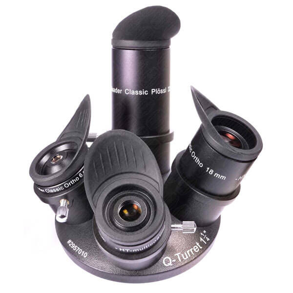 Револьверная насадка на телескоп, позволяющая одновременно использовать 4 окуляра c посадочным диаметром 1,25″. В набор входят окуляры с фокусным расстоянием 6 мм, 10 мм, 18 мм и 32 мм, двухэлементная линза Барлоу, 2,25х и коробка для хранения.Набор окуляров Q-Turret (# 2957000) состоит из следующих элементов:Четырехпозиционный револьверный окулярный узел Q-Turret (#2957010)Окуляр Classic Ortho 6 мм с лепестковым резиновым наглазником (#2954106)Окуляр Classic Ortho 10 мм с лепестковым резиновым наглазником (#2954110)Окуляр Classic Ortho 18 мм с лепестковым резиновым наглазником (#2954118)Окуляр Classic Plössl 32 мм с лепестковым резиновым наглазником (#2954132)Линза Барлоу Q-Barlow с двойным увеличением (1,3x и 2,25x) (# 2956185)Металлический кейс Astro-Box с мягкой вкладкой и окном (# 2957005)Все увеличения, которые вам нужны!Набор окуляров с револьверным узлом Q-Turret предлагает максимальную легкость в использовании и полную гамму увеличений, необходимых для вашего телескопа.Фокусные расстояния окуляров, предлагаемые этим набором:2,7 мм, 4,6 мм, 6мм, 8 мм, 10 мм, 14 мм, 18 мм и 32 мм.Окуляры Baader серии Classic предлагают уровень оптического качества, который ранее считался невозможным в данном ценовом диапазоне. Это достигается за счет использования несравненного дизайна самых первых ортоскопических окуляров фирмы Carl Zeiss и окуляров Плёссла, без каких-либо компромиссов при изготовлении.Окуляры серии Classic обеспечивают исключительную четкость и контраст по всему 50-градусному полю зрения, имеют превосходную эргономику, создающую благоприятное впечатление от наблюдений.Современные многослойные просветляющие покрытия с повышенным коэффициентом светопропускания, нанесенные на все поверхности границ «воздух-стекло», обеспечивают замечательные яркие изображения.Как пользоваться набором окуляров Q-TurretВсе четыре окуляра, входящие в комплект поставки, являются абсолютно парфокальными. Это означает, что при повороте револьверного узла вам не придется заново настраивать резкость. Таким образом, смену увеличения в телескопе можно производить в мгновение ока!Входящая в комплект поставки линза Барлоу Q-Barlow при использовании с любым окуляром комплекта поднимает увеличение этого окуляра в 2,25 раза. Помимо этого, оптическую группу линзы Барлоу можно отсоединить от втулки и присоединить непосредственно к втулке револьверного узла Q-Turret. Фактор увеличения при этом останется прежним – 2,25 раза, но будет действовать уже для всех четырех окуляров! (Одновременно с этим вынос фокуса телескопа увеличится на 25 мм.)Еще одним способом применения линзы Барлоу Q-Barlow является установка ее оптической группы (без втулки) перед одним из комплектных окуляров. При этом, благодаря уменьшению расстояния между окуляром и линзой Барлоу, фактор увеличения уменьшится с 2,25 до 1,3 раз.Один из окуляров набора может быть заменен на ПЗС-камеру или автогид. При этом эффект парфокальности сохраняется для любого присоединенного оборудования – при переключении с окуляра на ПЗС-камеру и обратно вам не потребуется дополнительная регулировка резкости.Комплект позволяет получить следующий набор фокусных расстояний:2,7 мм, 4,6 мм, 6 мм, 8 мм, 10 мм, 14 мм, 18 мм и 32 ммВарианты использования револьверного узла Q-Turret:Помимо стандартной работы с четырьмя окулярами револьверный узел Q-Turret может использоваться и для решения других задач:Установите вместо одного из окуляров гидирующ