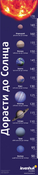 Ростомер Levenhuk «Дорасти до Солнца»позволяет не только следить за ростом ребенка, но и запомнить расположение планет Солнечной системы! Теперь вам не нужно будет ставить отметки на дверном косяке или обоях – с помощью ростомера вы всегда сможете точно измерить рост ребенка.Ростомер отпечатан на плотной глянцевой бумаге, при этом на него нанесены изображения планет в порядке убывания удаленности от Солнца (сверху вниз). Таким образом, ребенок будет расти и все больше приближаться к Солнцу, а попутно запомнит названия планет и расстояние от каждой из них до нашей звезды.Особенности:Ростомер с односторонней печатьюРазмер: 22х100 см