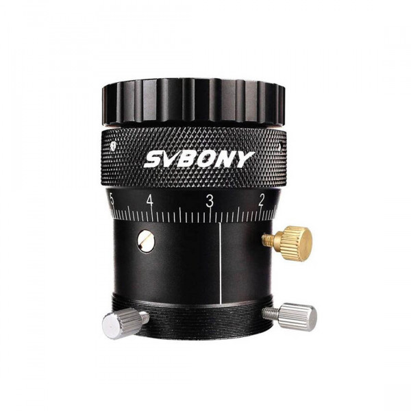 Двойной геликоидный фокусер SVBONY SV108 разработан для точной фокусировки при съемке астрономических объектов.Шаг разметки миллиметровой шкалы — 0.1 мм. Диапазон регулировки — 10 мм. При вращении ручки настройки не происходит вращения поля зрения — ваш окуляр или камера движется строго поступательно вдоль оптической оси.Корпус изготовлен из анодированного алюминиевого сплава. Вес: 102 грамм. Длина: 56-66 мм. Подсоединительные резьбы: T2 — T2 (M42 x 0.75). На выходе имеется гнездо для аксессуаров 1.25 дюйма.