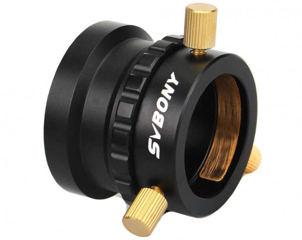 Недорогой резьбовой фокусер для оптических труб и труб-гидов. Изготовлен из анодированного алюминия, прочный и легкий. Состоит из трех частей: кольцо с внутренней T-резьбой (1), втулка для аксессуаров с баррелем 1.25 дюйма (2), стопорное кольцо (3). Втулка (2) и кольцо (1) взаимно соединены цилиндрической резьбой, при вращении втулки она плавно смещается по оси относительно кольца. Стопорное кольцо (3) фиксирует заданное положение — уприте его в кольцо (1). Для фиксации аксессуаров во втулке (2) предусмотрено латунное кольцо, прижимаемое тремя винтами с накатанной головкой.Обратите внимание, что при вращении резьбового фокусера поле кадра (окуляра) также вращается, в отличие от геликоидных фокусеров. Преимущество данного типа — простота конструции и низкая стоимость.